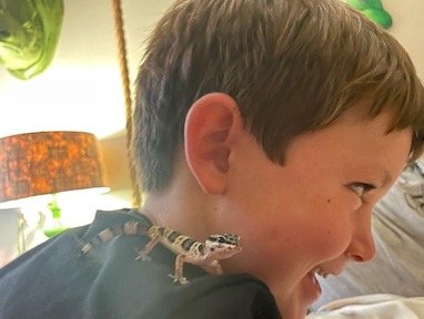 Joshua with Stripy, his leopard gecko. This was right after we got baby Stripy.